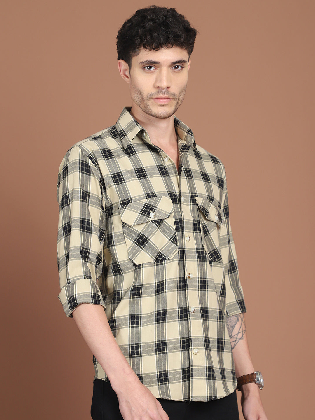 Elevate your wardrobe with this casual, youthful, trendy beige checked shirt, crafted from 70% Cotton 30% Polyester for ultimate comfort. Perfect for college wear, daily wear, casual outings.